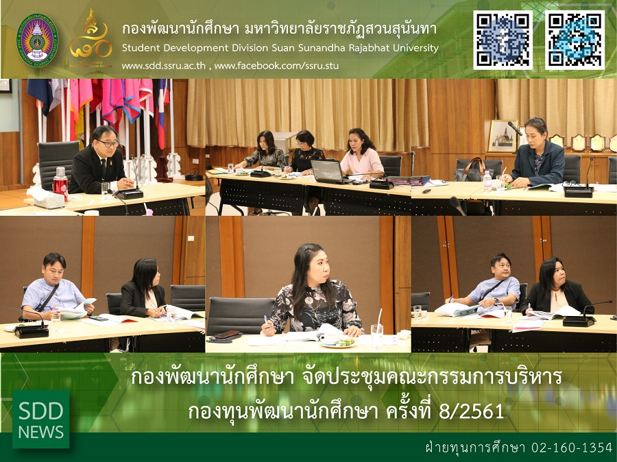 On November 14, 2018, 13:00 – 16:00 hrs, Scholarships Section of Student Development Division conducted the 8th Student Development Fund Administrative Board Meeting for 2018 at Worraraksananong Meeting Room, 3rd floor, Health and Sport Center Building. As a chairperson, Asst. Prof. Dr. Chananart Meenanan, Vice-President for Student Affairs said 100 scholarships were granted at the 80th Anniversary Celebration where Asst. Prof. Siri-Orn Champatong, Assistant to the President for Student Affairs and Mrs. Pornpris Praditpong, Director of SDD attended this meeting.