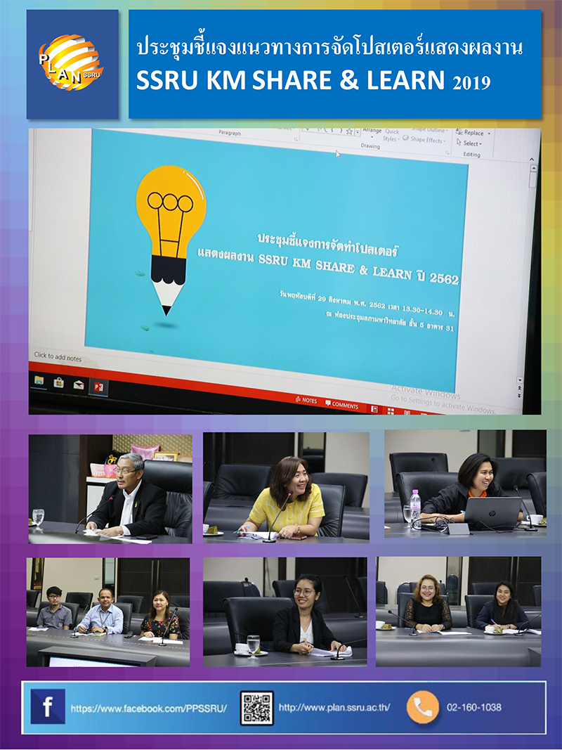 On Aug 29, 2019, at University council, 5th floor 31 building Policy and Planning Division organize Meeting to Clarified guidelines for SSRU KM SHARE & LEARN 2019 poster exhibition. Asst.Prof. Dr.witthaya mekhum Vice President for Planning and Quality Assurance presided over this meeting. Asst.Prof. Dr.witthaya give a chance for Attendees to share about SSRUKM activity in 2563 and He suggests to communicate Knowledge activity of academic staff and supporting staff for attention person. And then is clarified guidelines for SSRU KM SHARE & LEARN 2019 poster exhibition.