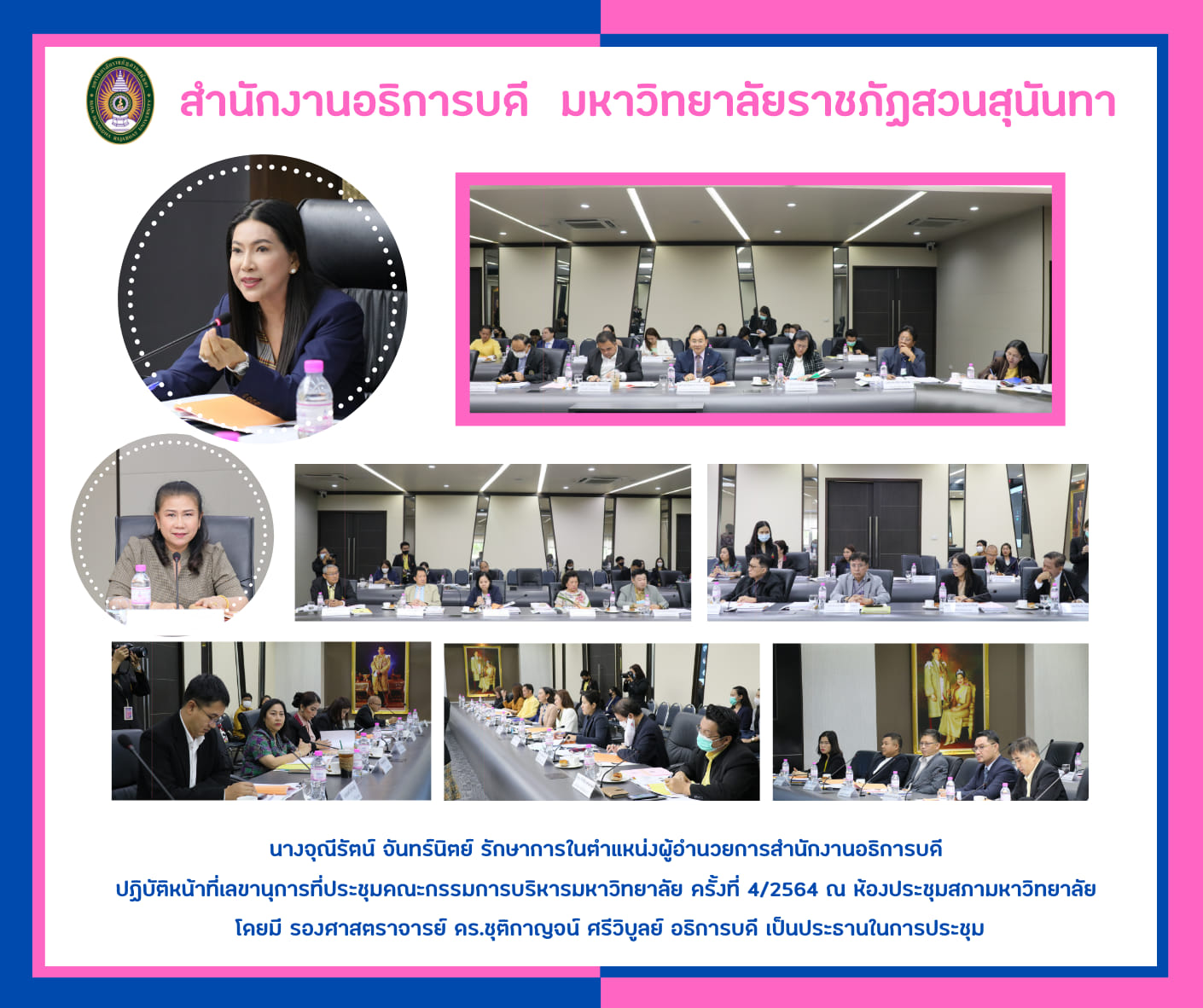 The 4th of the University Executive Board Meeting (April 5, 2021) Mrs.Juneerat Jannit, Acting Director of the Office of the President attends monthly University Executive Board (UEB) meetings as the board secretary's role and the President, Assoc.Prof.Dr. Chutikarn Sriwiboon as the chairman of the meeting. Attending the meeting, there were Executives, Dean, Head of Office, and staff; some participants attended the meeting via an online platform.