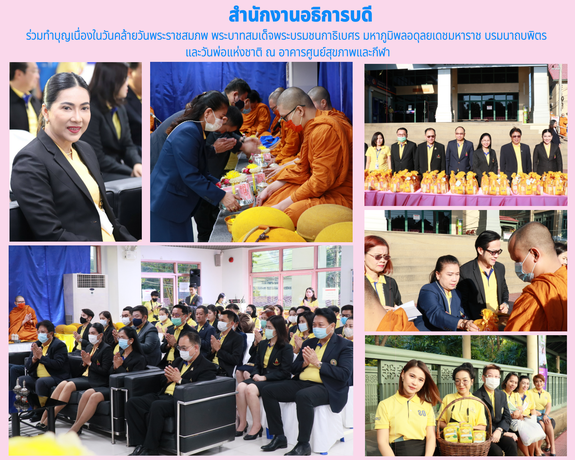 วันที่ 4 ธันวาคม 2563 นางจุณีรัตน์ จันทร์นิตย์ รักษาการในตำแหน่งผู้อำนวยการสำนักงานอธิการบดี เข้าร่วมทำบุญเนื่องในวันคล้ายวันพระราชสมภพ พระบาทสมเด็จพระบรมชนกาธิเบศร มหาภูมิพลอดุลยเดชมหาราช บรมนาถบพิตร และวันพ่อแห่งชาติ โดยมีรองศาสตราจารย์ ดร.ชุติกาญจน์ ศรีวิบูลย์ รักษาราชการแทนอธิการบดีเป็นประธานในพิธี พร้อมผู้บริหาร คณาจารย์ เจ้าหน้าที่ และนักศึกษา ร่วมทำบุญตักบาตรพระสงฆ์ 10 รูป บริเวณหน้าอาคารศูนย์สุขภาพและกีฬา มหาวิทยาลัยราชภัฏสวนสุนัทา