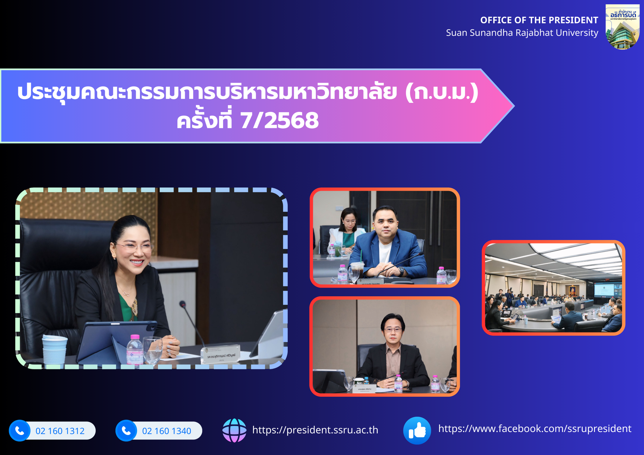 วันที่ 9 กรกฎาคม 2568 เวลา 08.30 น. นายนฤพล ศรีสว่าง ผู้อำนวยการสำนักงานอธิการบดี เป็นเลขานุการที่ประชุมคณะกรรมการบริหารมหาวิทยาลัย (ก.บ.ม.) ครั้งที่ 7/2568 โดยมี รองศาสตราจารย์ ดร.ชุติกาญจน์ ศรีวิบูลย์ อธิการบดี เป็นประธานในการประชุม ณ ห้องประชุมสภามหาวิทยาลัย อาคาร 31 ชั้น 5