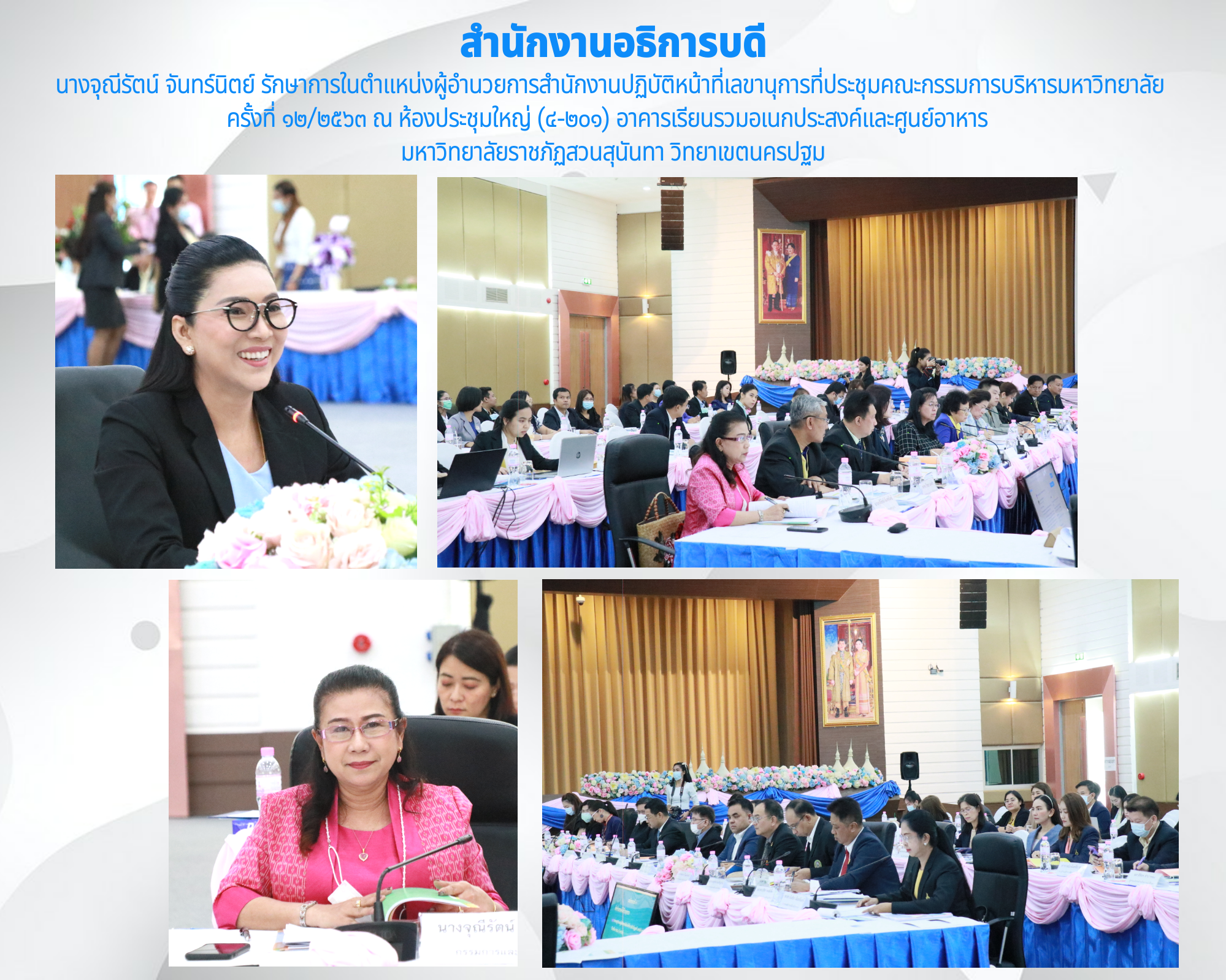 วันที่ 14 ธันวาคม 2563 นางจุณีรัตน์ จันทร์นิตย์ รักษาการในตำแหน่งผู้อำนวยการสำนักงานอธิการบดี เข้าร่วมประชุมคณะกรรมการบริหารมหาวิทยาลัยพร้อมปฏิบัติหน้าที่เลขานุการในที่ประชุม โดยได้รับเกียรติจากรองศาสตราจารย์ ดร.ชุติกาญจน์ ศรีวิบูลย์ อธิการบดีมหาวิทยาลัยราชภัฏสวนสุนันทา เป็นประธานในการประชุม พร้อมด้วยคณะผู้บริหาร หัวหน้าสำนักงาน ณ ห้องประชุมใหญ่ อาคารเรียนรวมอเนกประสงค์และศูนย์อาหาร มหาวิทยาลัยราชภัฏสวนสุนันทา วิทยาเขตนครปฐม