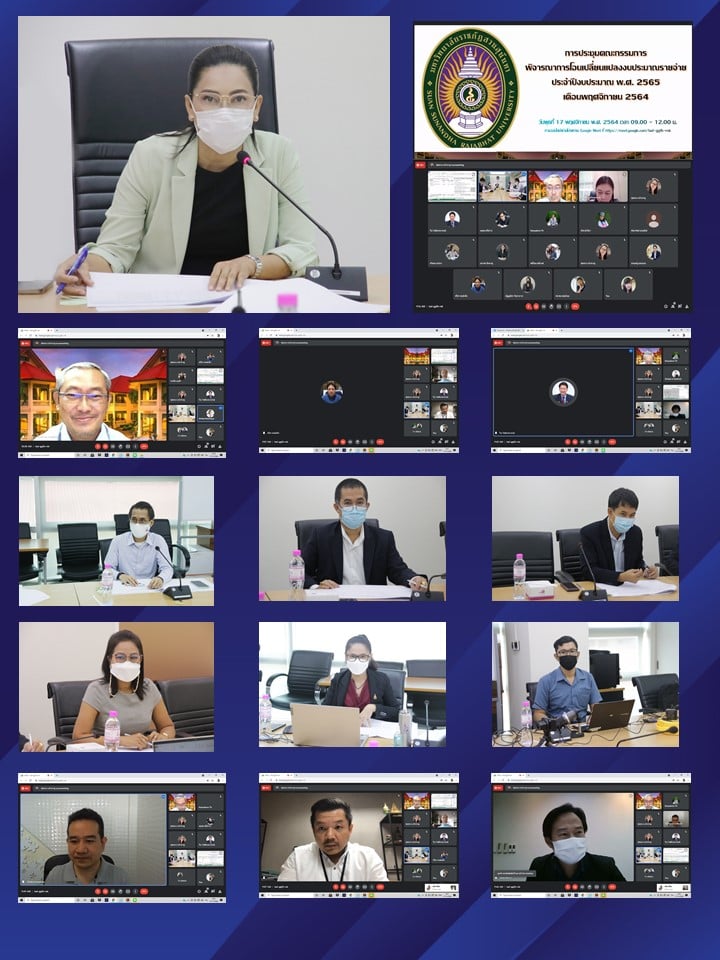 วันที่ 17 พฤศจิกายน 2564 เวลา 9.00 น. ฝ่ายติดตามงบประมาณและสารสนเทศ กองนโยบายและแผน จัดการประชุมคณะกรรมการพิจารณาโอนเปลี่ยนแปลงรายการงบประมาณ ประจำปีงบประมาณ พ.ศ. 2565 (เดือนพ.ย. 2564) มีรศ. ดร.ชุติกาญจน์ ศรีวิบูลย์ อธิการบดีมหาวิทยาลัยราชภัฏสวนสุนันทา เป็นประธาน โดย รศ.ดร.วิทยา เมฆขำ รองอธิการบดีฝ่ายแผนงานและประกันคุณภาพ ร่วมประชุมพร้อมผู้เกี่ยวข้อง ผ่านระบบออนไลน์ Google Meet