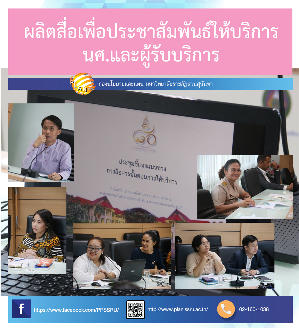 วันที่ 25 กุมภาพันธ์ 2562 นายสนธยา เจริญศิริ รักษาการในตำแหน่งผู้อำนวยการกองนโยบายและแผน ประชุมชี้แจงแนวทางการสื่อสารขั้นตอนการให้บริการ ณ ห้องประชุมสำนักงานอธิการบดี ชั้น 5 มหาวิทยาลัยราชภัฏสวนสุนันทา ที่ประชุมได้ชี้แจงให้หน่วยงานพิจารณาเลือกกระบวนการที่สำคัญในการให้บริการ พร้อมจัดทำสื่อประชาสัมพันธ์ในช่องทางต่างๆเพื่อให้นักศึกษา และผู้รับบริการได้รับทราบกระบวนการให้บริการนั้นๆ โดยมีกำหนดให้เสร็จสิ้นภายในวันที่ 15 มีนาคม 2562